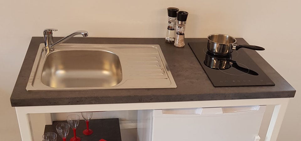 Si elles sont compactes, nos cuisinettes sont parfaitement aménagées pour que vous puissiez laver, découper, cuisiner, ranger vos poêles, casseroles, couverts et ustensiles de cuisine.